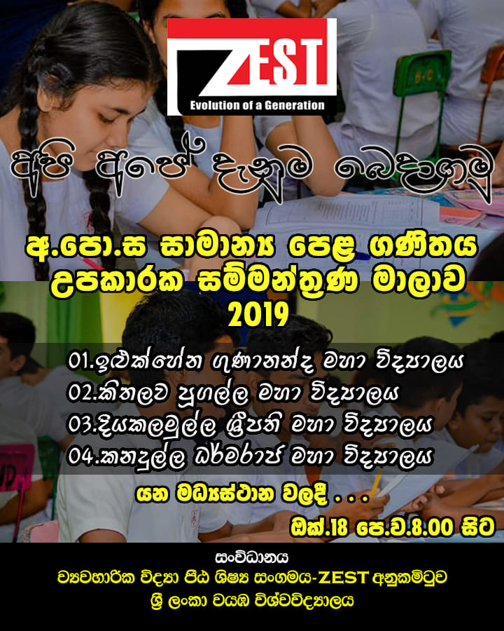 වයඹ අහස යට සමාජ සත්කාරය යටතේ ශ්රී ලංකා වයඹ විශ්වවිද්යාලයීය ව්යවහාරික විද්ය පීඨ ශිෂ්ය සංගමය සහ Zest- අපි අපේ දැනුම බෙදා ගනිමු වැඩසටහනට සමගාමීව සංවිධානය කරනු ලබන අ.පො.ස සාමාන්ය පෙළ ගණිතය සම්මන්ත්රණ මාලාව 2019/10/18 දින පෙ.ව. 8.00 සිට ආරම්භවේ.